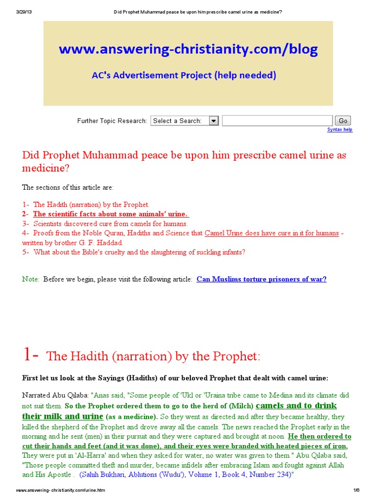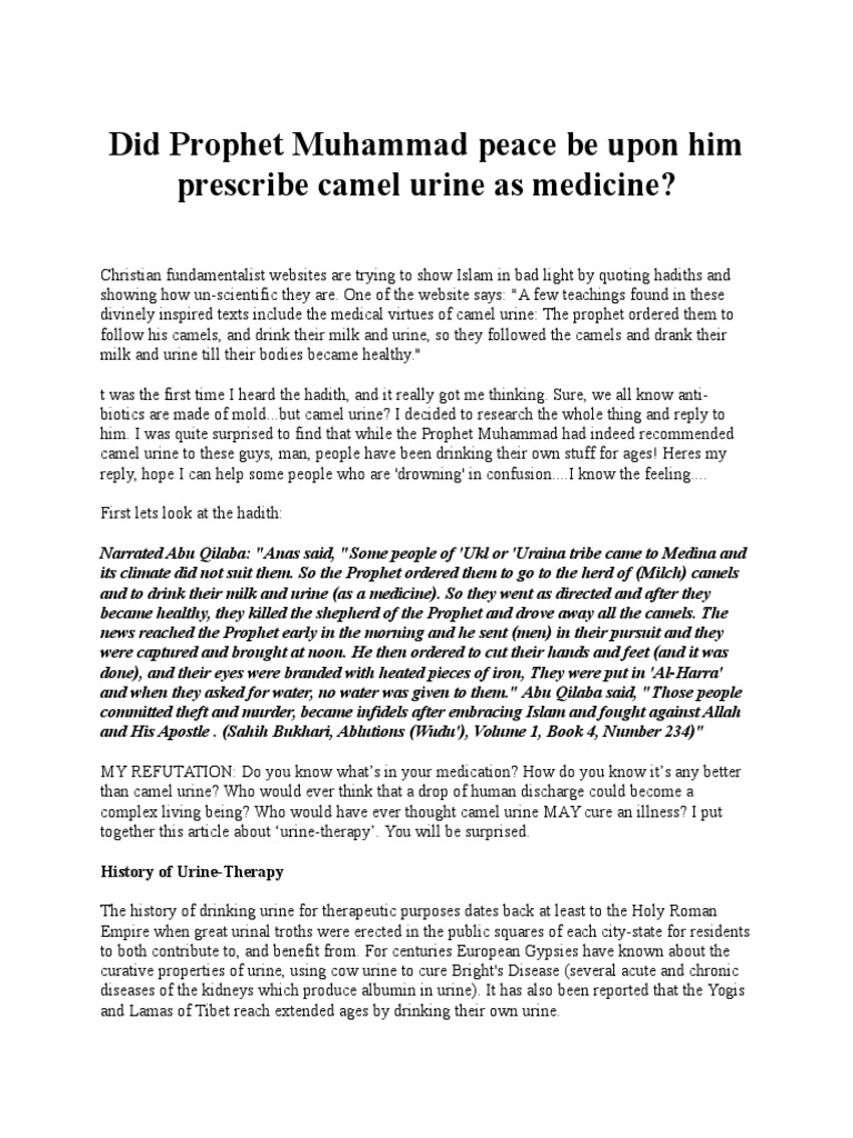 Abulmiswar Muhammadjameel Posts Facebook from lookaside.fbsbx.com So the prophet ordered them to go to the herd of (milch) camels and to drink their milk. After the men got better, they brutally murdered the was it necessary for muhammad to torture the criminals the way he did? The climate of medina did not suit them, so the prophet ordered them to go to the (herd of milch) camels of charity and to drink, their milk and urine (as a medicine). Is camel urine all that bad? I am not advocating drinking urine today, because science and medicine have advanced to levels that are far beyond any primitive society of old. Did the prophet (pbuh) advise drinking camel's urine? This article is about the use of camel urine as medicine in the hadiths and how such usage is viewed in the muslim world. The history of drinking urine for therapeutic purposes dates back at least to the holy roman empire when great urinal troths were erected in the public hence, the prophet muhammad (peace and blessings be upon him) said to them, that they would find a cure in the milk and urine of a camel and.