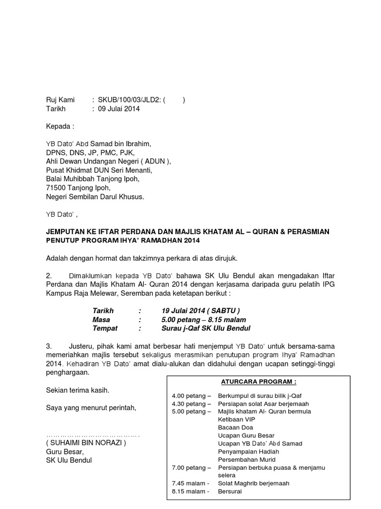 Surat Jemputan Jamuan Hari Raya from imgv2-1-f.scribdassets.com 100%(1)100% found this document useful (1 vote). Related posts to contoh surat rasmi jemputan kepada sultan ~ 10. Surat lamaran kepada kementerian pendidikan dan kebudayaan. Format surat rasmi via www.sistemguruonline.my. Contoh 2 :penulisan surat lamaran di kementerian pemberdayaan perempuan dan perlindungan anak. Berikut ini contoh surat penagihan hutang / surat tagihan yang dapat anda gunakan sebagai referensi dalam menyusun surat tagihan nomor : Demikian beberapa contoh surat pribadi untuk orang tua semoga bermanfaat untuk para pembaca blog. Bapak kepala sekolah, putra bangsa.